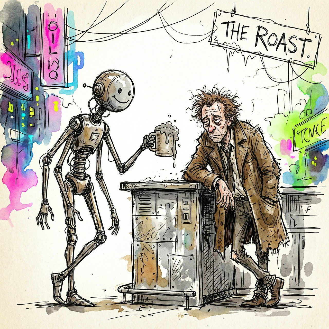 He pushed through a door that slid open with a sound like a sigh. Inside, it smelled of ozone and damp wool, not coffee. A robot with six arms was wiping the counter.